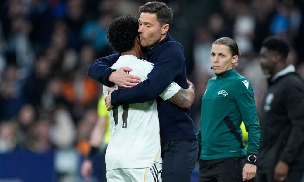 Real Madrid forward Rodrygo celebrated his first goal in 32 matches with a heartfelt hug for coach Xabi Alonso during the team’s 2-1 defeat to Manchester...