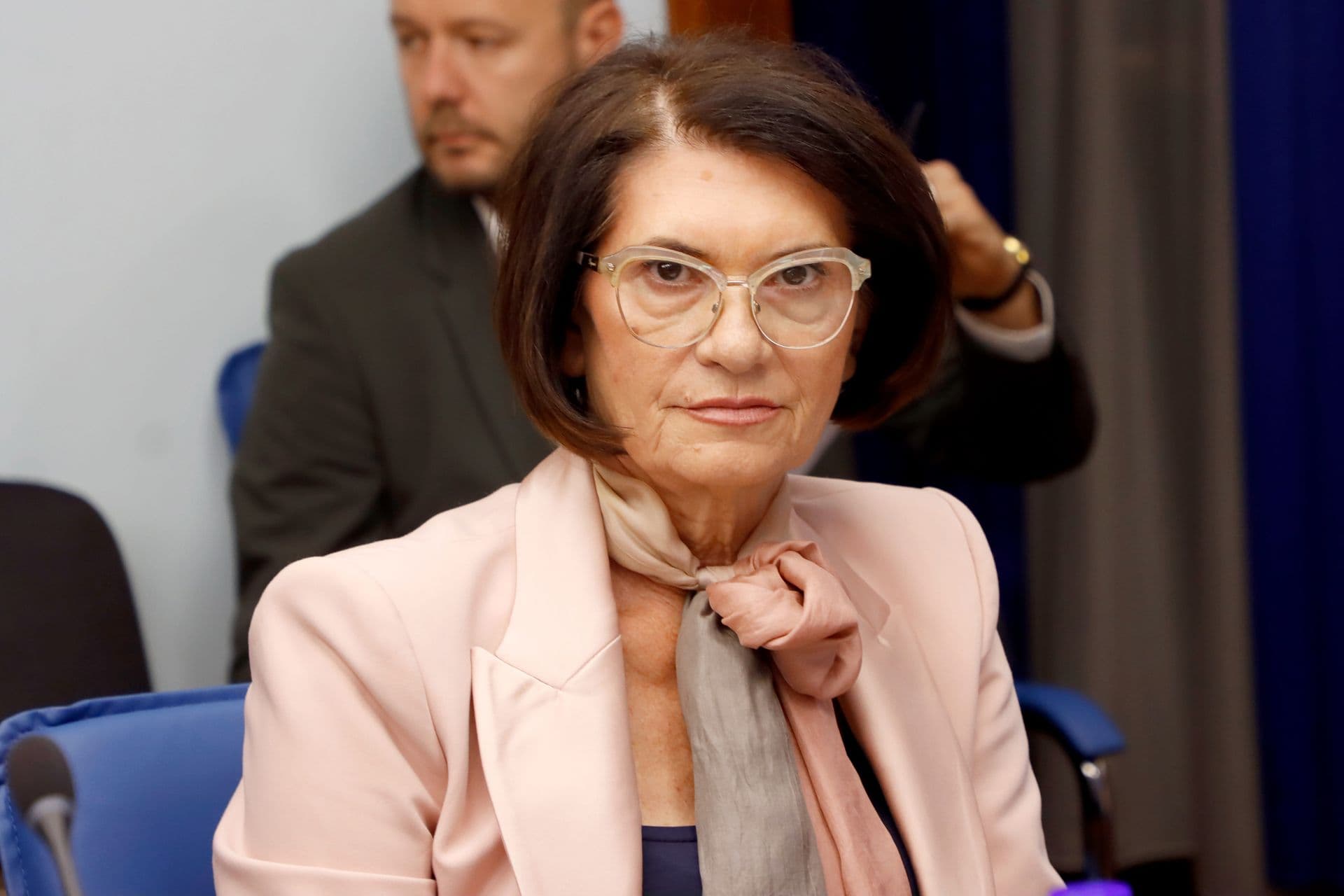 Zorica Čupić stands out with an outfit that embodies a cultivated sense of style. The color palette she chose is notably rare in business attire, showcasing her ability to combine hues that many struggle to harmonize effectively. The soft and romantic shade of her blazer exudes calmness, while its pairing with a navy blouse reinforces a sense of professionalism and moderation. The two-tone patterned scarf she wore adds a focal point of interest, not only for its aesthetic appeal but also for its quality. Furthermore, her hairstyle and eyewear complement the overall look, affirming her sophisticated fashion sense.